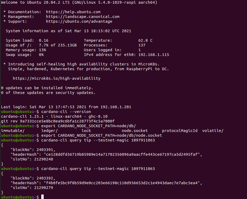 Run export CARDANO_NODE_SOCKET_PATH=/cardano-node/example/socket/node-1-socket 4.